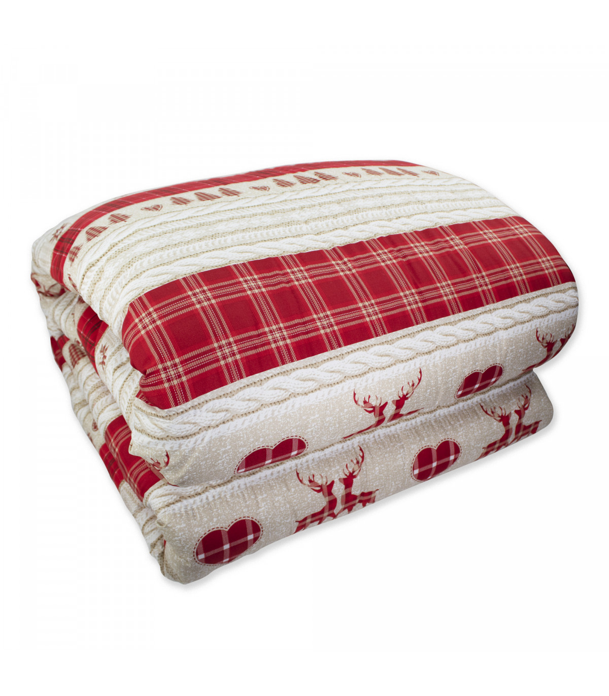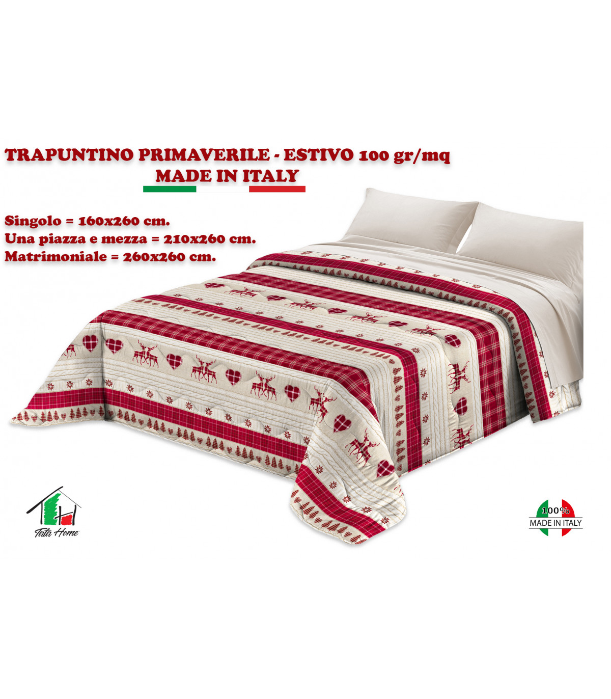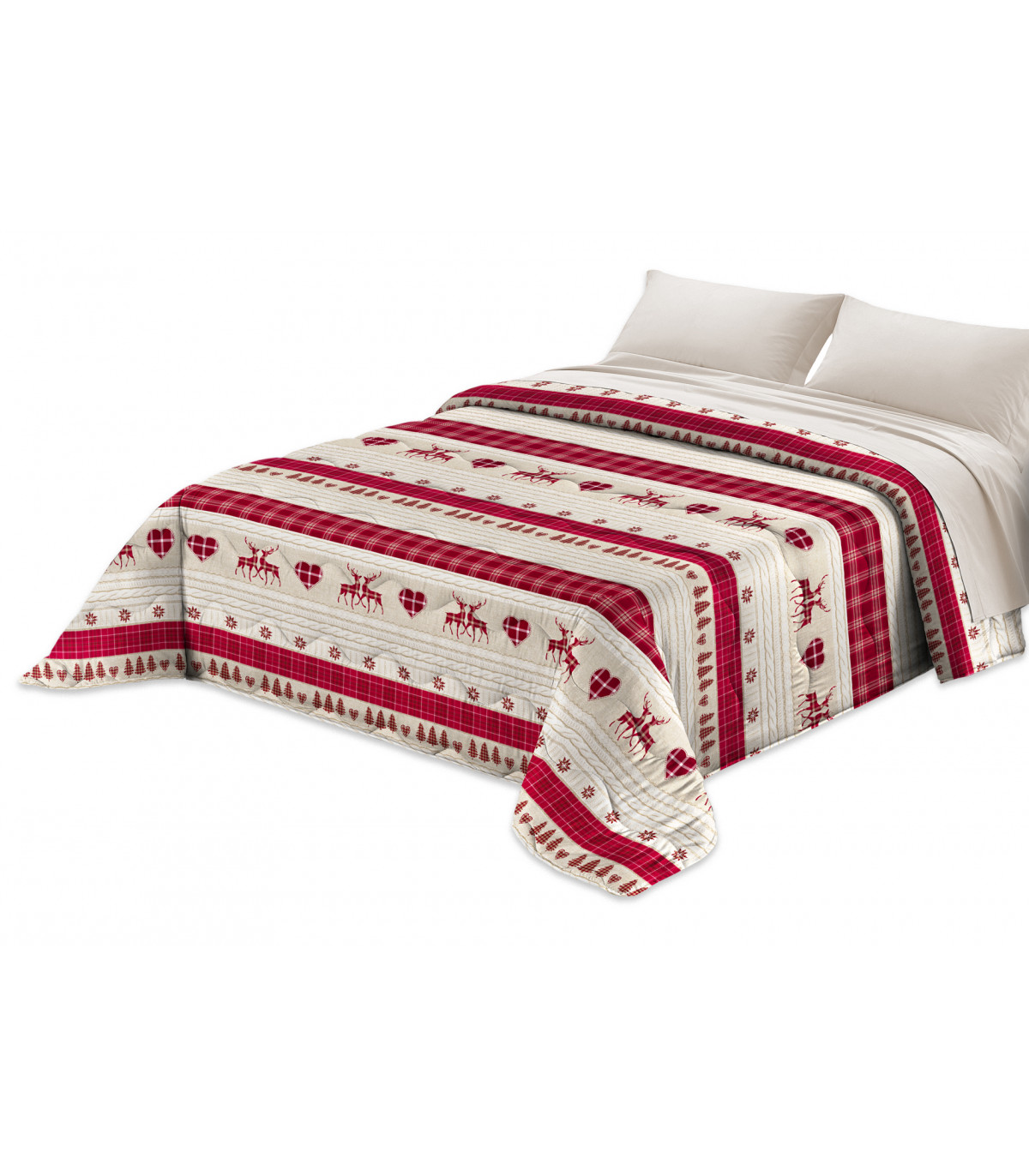 • PIUMONE TRAPUNTATO PRIMAVERILE con fantasia tirolese dai dettagli nordici, stelle alpine e cervi circondati da molteplici cuori. Disegno classico e di stile tipico alpino adatto per ogni tipo di arredamento della vostra camera da letto che grazie ai colori brillanti e all’eleganza che si contraddistingue in ogni ambiente. Trapuntino double face, un lato in fantasia e un lato tinta unita.