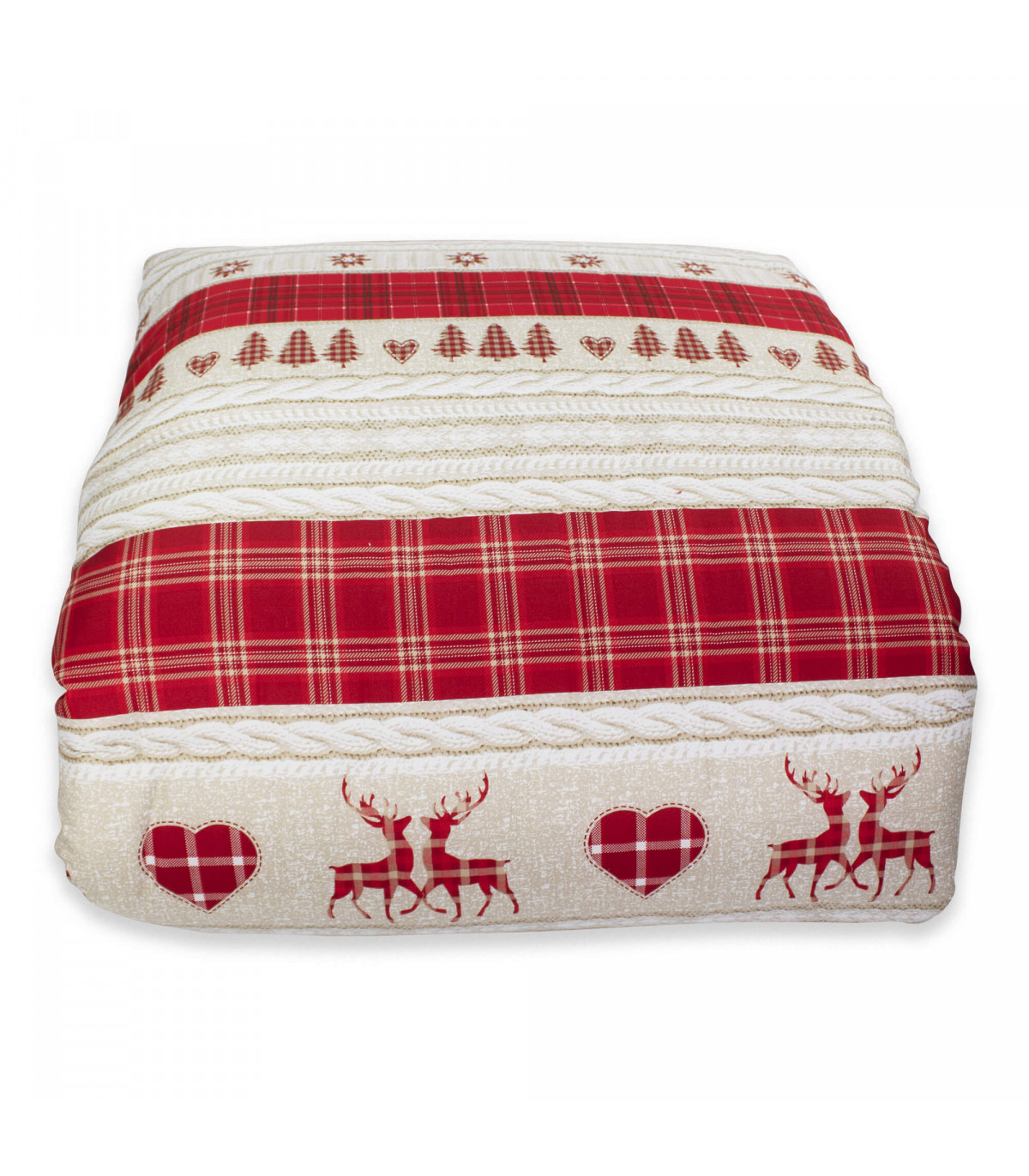 - COPRILETTO TRAPUNTATO PRIMAVERILE con fantasia tirolese dai dettagli nordici, stelle alpine e cervi circondati da molteplici cuori. Trapuntino double face, un lato in fantasia e un lato tinta unita.