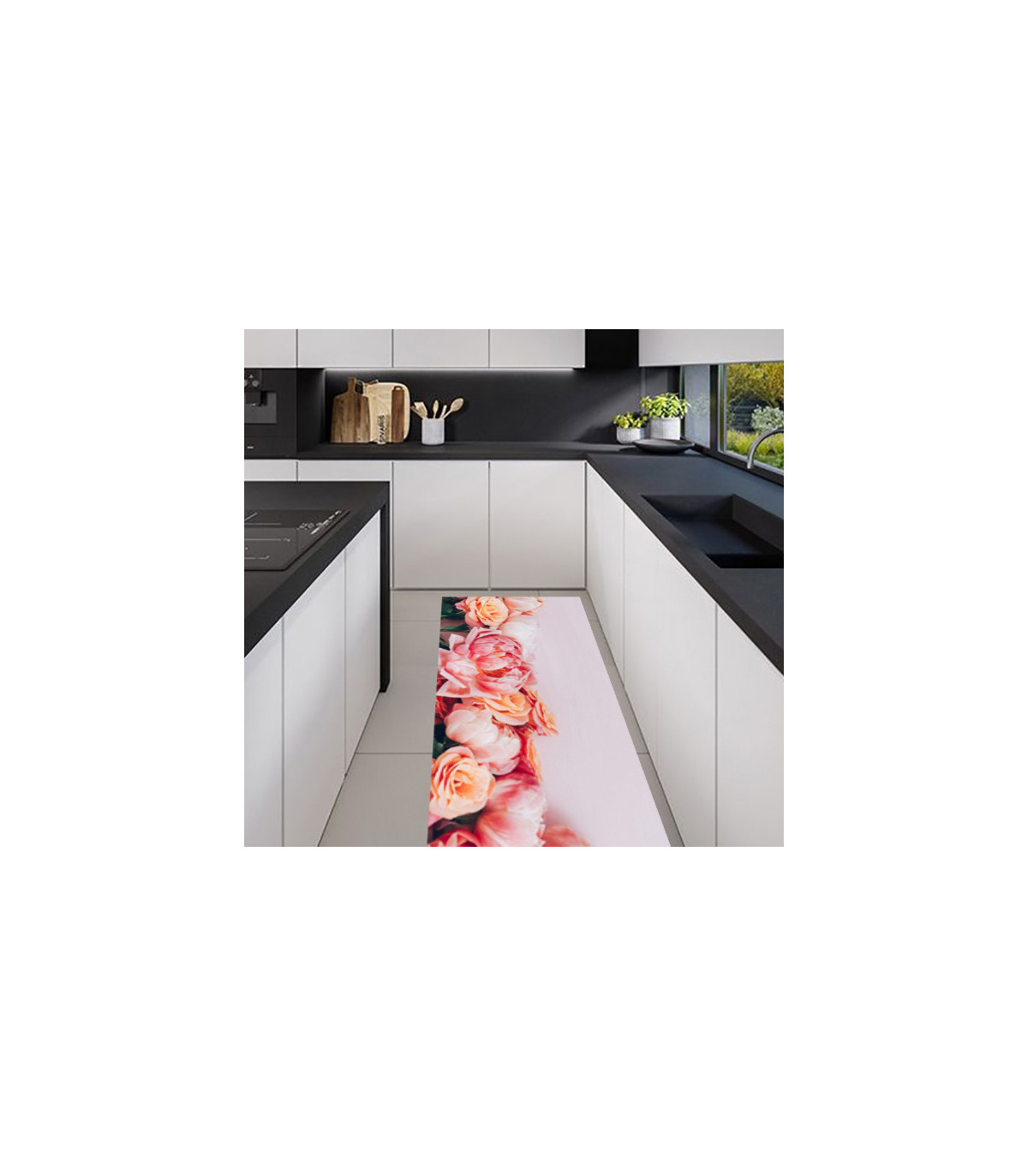 Passatoia Tappeto da Cucina Antiscivolo e Antimacchia Flessibile Dis. PEONIE ROSA
