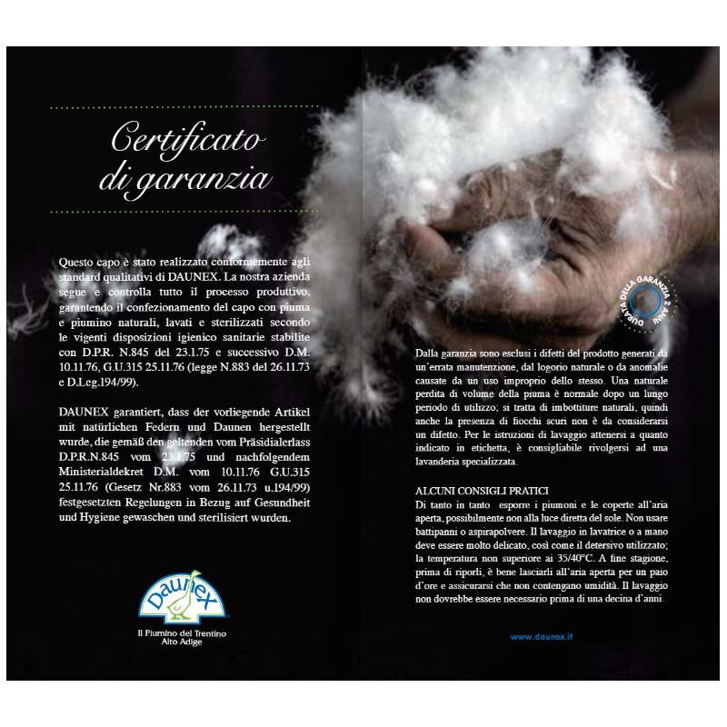 • MATERIALI: 100% Piumino d'oca naturale di prima scelta anallergico ed antibatterico. Tessuto 100% cotone "Inlett" a trama fitta. Imbottitura in Piumino d’oca testato secondo gli standard OEKO-TEX e EDFA.