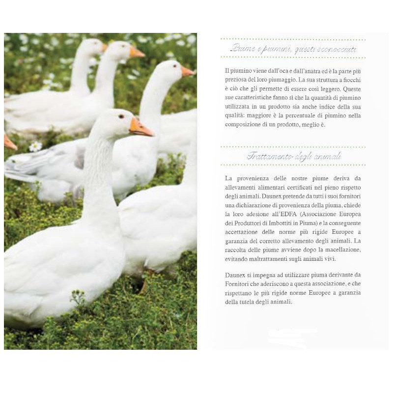 • MATERIALI: 100% Piumino d'oca naturale di prima scelta anallergico ed antibatterico. Tessuto 100% cotone "Inlett" a trama fitta. imbottitura in Piumino d’oca testato secondo gli standard OEKO-TEX e EDFA. La piuma ha moltissime qualità di pregio tra cui la COIBENZA (potere termico), l'IGROSCOPICITA' nonchè l'assorbimento del vapore acqueo emanato dal nostro corpo e la TRASPIRABILITA' essendo un materiale 100% naturale.